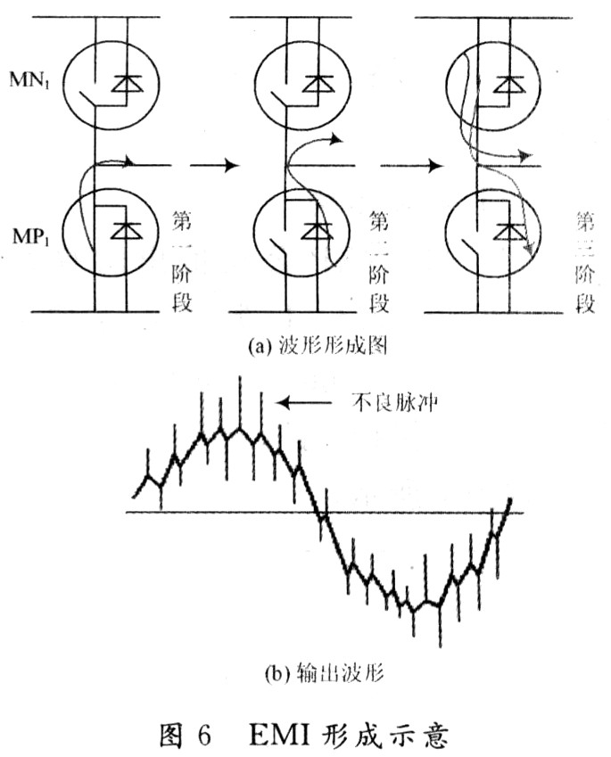 (1)輸出信號中將產生毛刺,造成電磁干擾,也即死區時間內,IN1/IN3都關斷。完全失控的輸出電壓將受到圖6(a)中體二極管電流的影響(體二極管電流的形成,參見下文EMI節),輸出波形中將出現毛刺干擾。