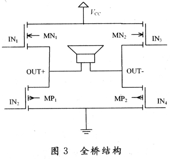 全橋MOSFET管輪流成對導通,理想狀態一對導通,另一對截止,但實際上功率管的開啟關斷有一個過程。過渡過程中,必有一瞬間,如圖3所示,在IN1/IN3尚未徹底關斷時IN2/IN4就已開始導通;因MOSFET全部跨接于電源兩端,故極端的時間內,可能會有很大的電壓電流同時加在4個MOSFET上,導致功耗很大,整體效率下降,而且器件溫升加劇,燒壞MOSFET,降低可靠性。為避免兩對MOSFET同處導通狀態,引起有潛在威脅的很大短路電流,應保證一對MOSFET導通和另一對MOSFET截止期間有一個很短的停滯死區時間(Dead-time),這個時間由Logic邏輯控制器控制,以有效保證一組MOSFET關斷后,另一組MOSFET再適時開啟,減小MOSFET損耗,提高放大器效率。