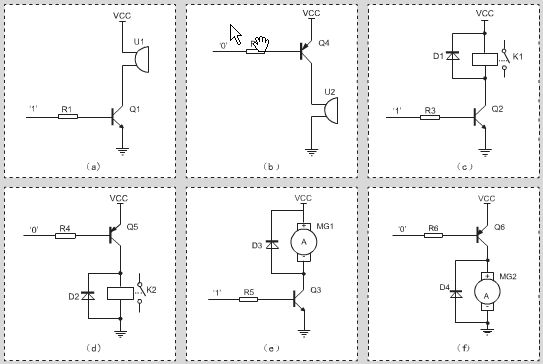 選用NPN 型、還是PNP 型晶體管驅動負載,要看設計者的要求。如圖1(a)、(c)、(e)是使用NPN 型晶體管驅動負載的電路,高電平“1”可以控制晶體管導通(負載通電)、低電平“0”使晶體管截止(負載斷電)。而圖1(b)、(d)、(f)是使用PNP 型晶體管驅動負載的電路,導通條件剛好相反。