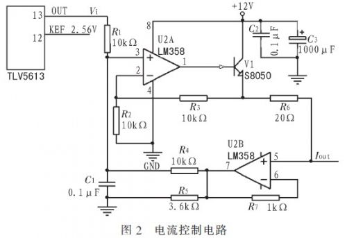 電流控制電路采用數(shù)模轉(zhuǎn)換器芯片TLV5613加上V/I轉(zhuǎn)換電路構(gòu)成穩(wěn)定電流源,可通過單片機(jī)程序控制輸出所需要的電流給測(cè)量回路供電以滿足系統(tǒng)測(cè)試對(duì)電流的要求。在極性測(cè)試環(huán)節(jié)可給出合適的電流值,便于系統(tǒng)測(cè)量二極管電壓值并據(jù)此判斷二極管的好壞及極性;在特性測(cè)試環(huán)節(jié)可根據(jù)設(shè)定電流值增大或減小回路電流,使其與設(shè)定值一致;在伏安特性曲線繪制環(huán)節(jié)可給出由小到大逐漸增大的電流值便于系統(tǒng)采樣繪圖。