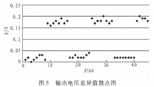 在軟硬件設(shè)計(jì)全部完成后的測(cè)試階段,發(fā)現(xiàn)DA輸出的電壓值在某些點(diǎn)上與理論值不符,具有較大差異并呈現(xiàn)一定的周期性(且都是輸出值比理論值小)。通過初步分析,認(rèn)為是DA的控制字寫入在某些點(diǎn)上不正確,于是將硬件電路上AD的模擬電壓輸入引腳斷開并直接接在DA電壓輸出腳,并編寫了測(cè)試小程序,將0~5V每次遞增0.02V對(duì)應(yīng)的控制字寫入DA,用AD測(cè)其輸出電壓值并將結(jié)果通過串口返回PC,然后將電壓理論值與實(shí)測(cè)值的差值全部導(dǎo)入Excel,然后在Excel中插入這些值的散點(diǎn)圖,散點(diǎn)圖如圖5所示,0~250mA電流值分別對(duì)應(yīng)0~5V的電壓值(圖中截取了0~45mA這一段),縱坐標(biāo)為輸出電壓理論值與實(shí)際值的差異值。