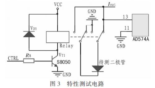 特性測(cè)試電路如圖3所示,圖中左側(cè)為繼電器控制電路,當(dāng)CTRL端為高電平時(shí),三極管VT1導(dǎo)通,VCC通過VT1加載到繼電器5引腳,繼電器動(dòng)作,被測(cè)二極管接入極性轉(zhuǎn)換,二極管極性匹配后,即可進(jìn)行特性測(cè)試。