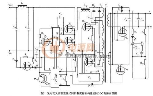 圖 3所 示 為采用交叉級聯正激變換電路設計的通信設備專用DC-DC半磚電源原理圖。工作原理如下,R,, R2. D,, Q,, D:和C:組成自舉啟動電路,得到啟動電壓Vc分別給ICI,I C2和IC3供電。電路啟動后,T,的輔助繞組經D3整流,C3平滑濾波后為IC提供電壓VD,因VD電壓高于Vc,二極管D2反偏,Q、的供電關閉,達到啟動電路無功耗的目的。IC:的腳6輸出方波信號,一路直接送到ICl的腳5,另一路經Q2倒相后送到IC:的腳6作為IC,的輸入信號。IC,的腳3和腳8輸出相位相差180“的方波脈沖信號,分別驅動MOSFETQ 31 Q 4- Q3" Q 4" L 2等組成高效率的同步降壓級,降壓級的占空比保持在30-60%. IC3.Qs"Q6"T.等組成交叉級聯正激式隔離級,達到DC-DC最終的輸出電壓。馬、DS為變壓器T,的磁復位繞組。由于降壓級已將變化范圍較寬的輸入電壓嚴密調整為中間總線電壓,因此隔離級不需調壓。交叉級聯正激變換器都工作在50%的占空比,可以采用VDS為100V的MOSFET. Q7, Q:等組成自偏置式同步整流電路,因隔離級的輸出電壓是固定的,所以同步整流MOSFET漏極的輸入電壓也是固定的,占空比也為50%,可以使用VDS很低的MOSFET(本例中采用的是VDS為12V的MOSFET,損耗最低)因功耗引起的發熱問題均可以方便解決。因輸入電壓固定,多出電壓時,能夠方便地實現高電壓調整率和高負載調整率,單級變換器很難做到此點。其他電路功能(如過流、過壓、過溫度保護等)不再一一闡述。經測量該電路的工作效率約在92%左右,達到預定的設計要求,并且調試較簡單,為今后的批量生產奠定了基礎。