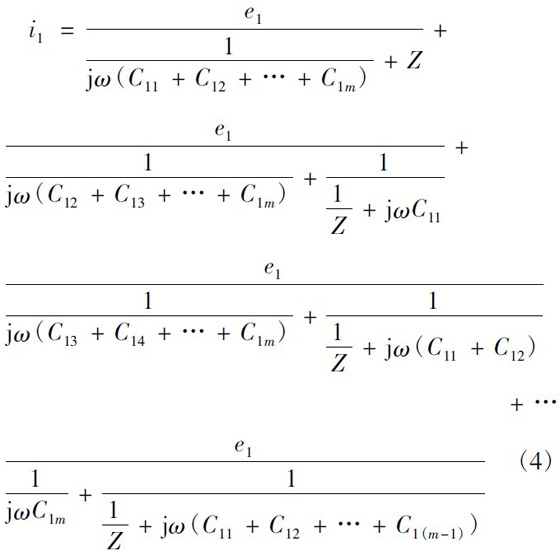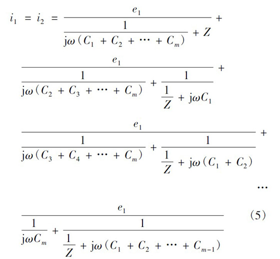 設一次繞組有3 層,每層m 匝,二次繞組僅一層,為n 匝。當變壓器磁芯中的磁通發生變化,便會同時在一次側和次級產生感應電動勢。根據疊加定理,可認為這是僅一次繞組有感應電動勢、二次繞組電動勢為零和僅二次繞組有感應電動勢、一次繞組電動勢為零兩種情況的疊加。僅一次繞組有感應電動勢、二次繞組電動勢為零的情況如圖5 所示。圖5 中:e1為每匝一次繞組的感應電動勢;C1x為一匝最外層一次繞組與二次繞組間的寄生電容。