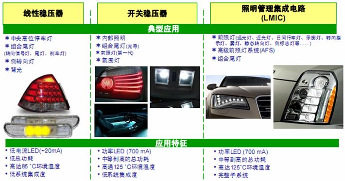 驅(qū)動(dòng)LED的開(kāi)關(guān)穩(wěn)壓器的能效一般介于50%至90%之間,涉及降壓、升壓及降壓-升壓等不同拓?fù)浣Y(jié)構(gòu),講究EMI控制方法,主要用于汽車內(nèi)部照明、停車燈、霧燈、日間行車燈及側(cè)面標(biāo)志燈等應(yīng)用。