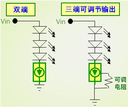 適合低電流LED應(yīng)用的CCR,可以采用安森美半導(dǎo)體運(yùn)用專利自偏置晶體管(SBT)技術(shù)開(kāi)發(fā)出來(lái)得NSI45系列。這系列CCR包含雙端固定輸出和三端可調(diào)節(jié)輸出兩種類型,電流等級(jí)涵蓋10至180 mA,雙端及三端CCR電路圖如圖2所示。其中三端可調(diào)節(jié)輸出CCR包括電流30至80 mA(SOT-223)及60至150 mA(DPAK)等不同選擇,能夠用于滿足特定電流設(shè)置要求。