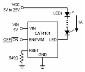 而在要求驅(qū)動(dòng)大電流的高亮度LED汽車照明應(yīng)用中,可以采用安森美半導(dǎo)體的CAT4101高亮度線性LED驅(qū)動(dòng)器。CAT4101能驅(qū)動(dòng)一串電流高達(dá)1 A的高亮度LED,且滿載時(shí)的壓降僅為極低的0.5 V。這種簡(jiǎn)單方案不要求電感,消除開(kāi)關(guān)噪聲,將元件數(shù)量減至最少,并簡(jiǎn)化設(shè)計(jì),典型應(yīng)用電路如圖5所示。