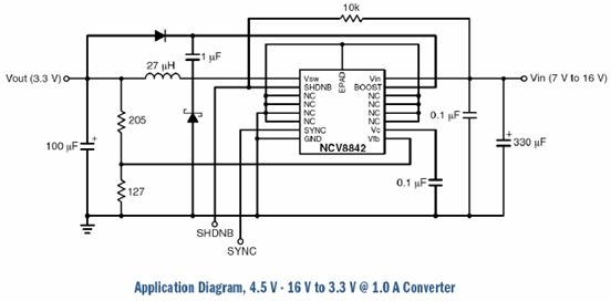 在降壓開(kāi)關(guān)驅(qū)動(dòng)器方面,包括NCV8842、NCV8843及NCV51411等產(chǎn)品,適合于車身/遠(yuǎn)程信息系統(tǒng)等應(yīng)用。NCV8842/3是帶同步功能的1.5 A、170/340 kHz降壓驅(qū)動(dòng)器,支持4.5 V至40 V輸入電壓,而輸出電壓可從1.27 V開(kāi)始編程設(shè)定。同步引腳功能用于改善EMI性能。