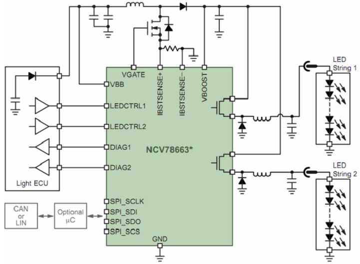 一般而言,汽車前照燈要求支持從單個(gè)LED到多串LED,電壓可高達(dá)60 V;此外,還要求支持脈寬調(diào)制(PWM)調(diào)光(如用于示廓燈)、高集成度、高能效、LED串低電磁輻射、集成診斷及通信接口等。安森美半導(dǎo)體針對(duì)LED汽車前照燈系統(tǒng)開(kāi)發(fā)了NCV78663電源鎮(zhèn)流器及雙LED驅(qū)動(dòng)器。NCV78663是先進(jìn)的高可靠性、高能效的系統(tǒng)級(jí)芯片(SoC) LED驅(qū)動(dòng)器,支持達(dá)2 A電流,提供高于90%的總能效,驅(qū)動(dòng)高達(dá)60 V電壓的多串LED,能以PWM調(diào)光維持色溫及控制平均電流,使設(shè)計(jì)人員能夠以一顆高集成度的SoC控制遠(yuǎn)光燈及近光燈、日間行車燈、轉(zhuǎn)向指示燈及霧燈,所需外部元件極少。這器件通過(guò)SPI接口與外部微控制器通信,在上電后動(dòng)態(tài)地控制系統(tǒng)參數(shù)、檢測(cè)LED工作狀態(tài)并反饋診斷信息。圖8顯示的是NCV78663在先進(jìn)的汽車前照燈應(yīng)用中的電路圖。