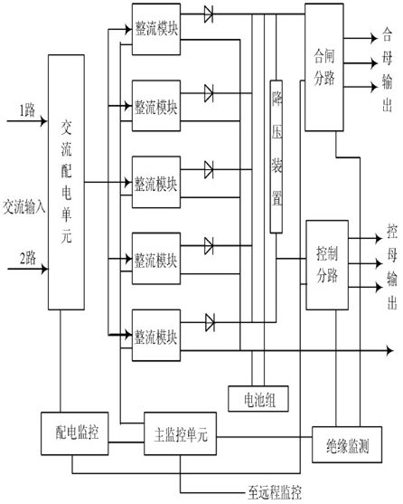 智能高頻開關電源系統的總體結構主要由主監控單元、配電模塊、交流配電單元、整流模塊等組成, 系統總體的結構圖如圖1 所示。系統中的各個監控單元受主監控單元的管理和控制, 通過通信線將各個監控單元采集的信息送給主監控統一管理。主監控顯示直流系統各種信息, 用戶也可以觸摸顯示屏查詢信息及操作,系統信息還可以接入到遠程監控系統中。系統除了交流監控、直流監控、開關量監控等基礎單位外, 還配置了絕緣監測、降壓裝置、電池巡檢等功能單元, 以達到對直流系統進行全面監控的目的。
