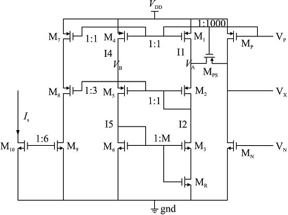 下面分析VB 與VA 的關(guān)系。假設(shè)在某個(gè)時(shí)刻,VB 的電位高于VA, 則VDS4 < VDS1, M4 中的電流I4 小于M1 中的電流I1, 而VDS5 > VDS2, 要求I5 > I2, 這使得在同一支路中I4 I5, 顯然不太可能, 所以VB 會(huì)與VA 相同, 且保持相同的動(dòng)態(tài)變化。因此, M1 中的電流被再次鏡像至M4, 而且, 由于反饋控制電流源的作用, VA 處的任何微小變化都會(huì)強(qiáng)迫VB 也有相同的變化, 保證了電流檢測(cè)的精度。