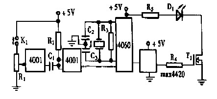 為了穩(wěn)定被調(diào)制光信號(hào)的頻率,電路中使用了分頻器CD4060 。它帶有一個(gè)外接晶體振蕩器,內(nèi)部有多級(jí)分頻器。對于1M 晶振來說,經(jīng)過4 060 的六次分頻,可以得到頻率穩(wěn)定的151625kHz 的方波,再通過功率場效應(yīng)管的電流放大,就可以同時(shí)驅(qū)動(dòng)上百個(gè)發(fā)光二極管同時(shí)發(fā)光。