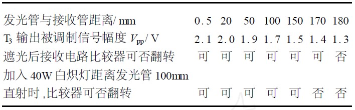 表1 為實(shí)驗(yàn)測得的數(shù)據(jù)。發(fā)光管和接收管之間正面相對, 兩者之間無聚焦光學(xué)元件。用有無遮光對整機(jī)主要參數(shù)進(jìn)行測試。由表可知,兩管表面之間的相對距離在015~170mm范圍內(nèi),無需調(diào)整靈敏度都能正常工作。