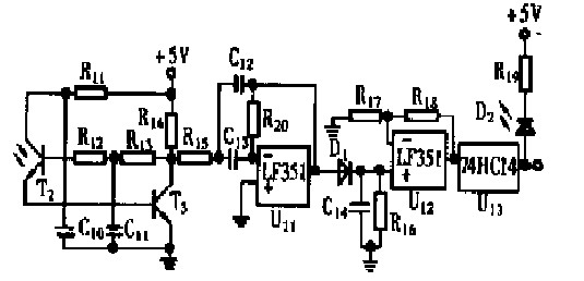 圖2 中的U11 組成二階帶通濾波器, 可以濾去151625kHz 以外的信號(hào)。該級(jí)增益為1 , Q 值為5 ,截止頻率、中心頻率以及濾波特性容易調(diào)整。二極管D1 和電容C14組成檢波電路,可以從151625kHz 信號(hào)上解調(diào)出包絡(luò)信號(hào)。上述兩部分電路可以濾除陽光、日光燈、白熾燈等干擾源的作用。