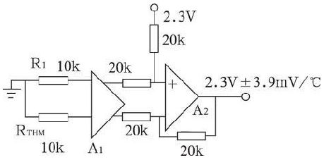 UC3909 內(nèi)部集成了具有鉛酸蓄電池溫度補償功能的電路如圖4 所示, A1 為電流/ 電壓轉(zhuǎn)換元件, 其輸入端分別接10 kΩ 普通電阻及10 k Ω 熱敏電阻。A2 與外接四個20 kΩ 電阻組成差動運算放大電路。RT HM 一般貼附在鉛酸蓄電池的表面殼體用于檢測其溫度, 當(dāng)鉛酸蓄電池內(nèi)部溫度變化時, 通過熱敏電阻RTHM 的反饋使U C3909 的基準(zhǔn)電壓2. 3 V 也隨溫度按- 3. 9 mV/℃ 的溫度系數(shù)變化。從而確保鉛酸蓄電池在浮充狀態(tài)下準(zhǔn)確工作于安全的浮充電壓, 保護了鉛酸蓄電池。