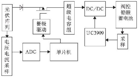 圖2 所示為基于U C3909 太陽能蓄電池充電器電路框圖, 光伏陣列經(jīng)過電壓電流采樣再經(jīng)模數(shù)轉(zhuǎn)換將數(shù)字信號反饋至單片機, 單片機根據(jù)光伏陣列的工作狀況輸出PWM 信號去驅(qū)動PMOS 管, 實現(xiàn)對光伏陣列的最大功率跟蹤。超級電容器組、DC/ DC 變換器、UC3909 用來實現(xiàn)對閥控鉛酸蓄電池的四階段充電控制, 并利用超級電容的特性優(yōu)化充放電過程。本文側(cè)重對超級電容器組、U C3909 及DC/ DC 變換器等部分實現(xiàn)對閥控鉛酸蓄電池四階段的充電分析及設(shè)計。