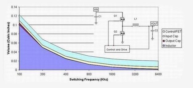 我們以濾波器組件作為開始。這些組件占據(jù)了電源體積的大部分,同時(shí)濾波器的尺寸同工作頻率成反比關(guān)系。另一方面,每一次開關(guān)轉(zhuǎn)換都會(huì)伴有能量損耗;工作頻率越高,開關(guān)損耗就越高,同時(shí)效率也就越低。其次,較高的頻率運(yùn)行通常意味著可以使用較小的組件值。因此,更高頻率運(yùn)行能夠帶來極大的成本節(jié)約。