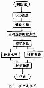 系統(tǒng)上電初始化并且清屏,單片機(jī)初始化完成后,進(jìn)入鍵盤掃描程序,當(dāng)要進(jìn)行電容或電感測量時,選擇測量按鍵,系統(tǒng)進(jìn)行自動判斷并進(jìn)行電容或電感的測量。當(dāng)判斷為電容時,系統(tǒng)選擇電容的計算方法。當(dāng)判斷為電感時,系統(tǒng)選擇電感的計算方法。計算完成后在液晶屏上顯示測量結(jié)果。下面是具體的程序流程圖,如圖3所示。