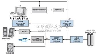 圖1顯示采用兩節串聯的AA電池供電的典型低功耗系統。電可用輸出范圍約為1.8 V至3.4 V,而IC工作時需要1.8 V和5.0 V 電壓。升壓轉換器可在不增加電池單元數量的情況下提升電壓,從而為WLED背光、微型硬盤驅動器、音頻設備和USB外設供電,而降壓轉換器可為微處理器、內存和顯示器供電。