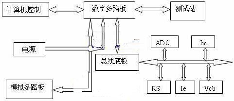 熱阻測(cè)試系統(tǒng)的基本構(gòu)架是計(jì)算機(jī)通過軟件控制精密模擬和數(shù)字電路,實(shí)現(xiàn)對(duì)被測(cè)器件的條件施加→結(jié)果采樣→篩選→計(jì)算→比較→判別等一系列程序控制,完成對(duì)被測(cè)器件電參數(shù)的自動(dòng)測(cè)試,每次測(cè)試的全過程小于0.2秒。系統(tǒng)主要有模擬多路板、數(shù)字多路板、ADC板、Im 板、Ie板和Vcb板組成,如圖1所示。
