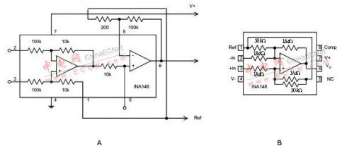 老式分路檢測電路基于差動放大器,即周圍帶四個電阻來設置增益并提供差動輸入的運算放大器 (operation amplifier)。這些電阻使運算放大器能接受超過其電源軌的共模電壓。不過,這也會帶來下面一些負面問題:一是電路必須配置為衰減器,在隨后的運算放大器級中恢復增益,如圖 2A 中的 IC 結構圖所示,運算放大器的增益會成倍增大第一個放大器的偏置和漂移量,從而降低整體性能。二是采用高共模電壓差動放大器要增加電阻網絡,以使之在仍然只提供單位增益的同時能夠接受較高的共模電壓。高共模差動放大器帶來的影響在于:運算放大器的噪聲增益與共模衰減成正比,如圖 2B 所示的差動放大器結構采用了 20:1 的內部共模衰減,此舉使放大器的偏置、漂移和噪聲都比運算放大器本身擴大了 20 倍。此外,較大的輸入電阻也會造成較高的噪聲。