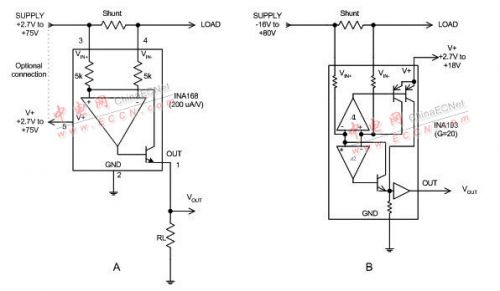 電流分路.是專門用于分路電流檢測的高共模電壓差動放大器,能夠解決電阻型差動放大器的局限性。電流分路.與差動放大器相比的主要區(qū)別在于:其共模電壓功能通常只擴展到正電壓,而一些電流分路.允許共模接地。這會造成更多的衍生情況,我們隨后還要談到。共模電壓功能也允許擴展到負電壓。電流分路.從一開始設計時就是以單電源電壓工作的,通常最低電壓可達 2.7V。圖 3 顯示了兩類電流分路.,分為電流輸出型分路.和電壓輸出型分路.。電流輸出型分路.通常靜態(tài)電流較低,需要外部輸出電阻,從而使終端用戶能夠設定增益。電壓輸出器件采用固定增益且不需要其他組件。