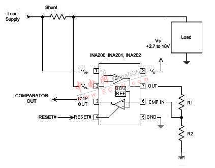 在許多應用中,電流應與某個設定值相比較。通常說來,進行電流比較還需要電流分路.、比較器和參考電壓。此外,理想的比較器輸出應與大多數(shù)常見的邏輯電路很好地兼容。圖 5 給出了電流比較的例子。在本例中,將電流與采用 TI INA200 系列電流分路.和比較器的簡單單電壓結點進行了比較。R1 和 R2 形成分壓器,以根據(jù) INA200 系列比較器的內置 0.6V 電壓結點來設置電壓結點。(INA200 系列的增益很有特點:INA200 的增益為 20,INA201 的增益為 50,INA202的增益為 100。)