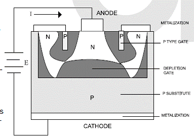 當一個反向偏壓加到PN結的陰極和陽極時,這個恒流二極管開始導通,當反向偏壓增加到VL時(見圖2),其電流由于N區的體電阻也跟著增加,當電流增加到曲線的拐點時,在N區和P型柵之間形成一個耗盡層。這個耗盡層減小了N區中電流的路徑也就減慢了電流的增加速度。結果這個耗盡層遇到了P型柵于是就產生了夾斷效應,這使得電流變成恒定而幾乎和所加電壓無關,直到所加電壓達到一個擊穿點Vb。如果所加電壓反過來,那么就相當于一個正向電壓加到一個PN結,其特性就和一個普通二極管加上正向電壓時一樣。