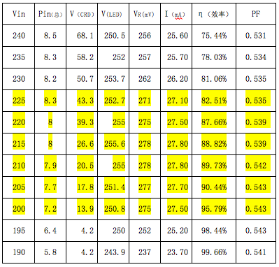 下面舉一個實測的結果為例,這是一個80顆3014串聯的球泡燈,采用了5顆Semitek 的S-562T并聯。它在不同的輸入市電電壓時,所測得的結果如下表所示。