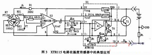 圖3是XTR115電路在溫度傳感器中的典型應用,溫度傳感器PT100和RE1、RE2、RE3組成測量橋路,恒流二極管2HD2為橋路提供2 mA的供電電流,運算放大器INA128組成差動放大電路,輸出被偏置在Vo=2.5 V的工作點上。放大器的輸出通過電阻RIN接到電流環變換電路XTR115。運算放大器INA128的靜態電流為700μA;所以輸出端還須加入1.3 mA的偏置電流,這個電流可以通過電流偏置電阻Rs獲得,Rs=2.5V/(1.3 mA/100)=192.3kΩ。
