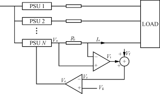 Ri為任一并聯模塊輸出電流Io的采樣電阻,經電流放大產生電流反饋電壓信號Vi,Vf為輸出電壓反饋,Vr為Vi與Vf的和,Vg為控制基準電壓(5V),Ve為誤差電壓。當某一模塊輸出電流Io偏大時,電壓與電流反饋合成信號Vr=Vi+Vf增大,與Vg進行比較后,使Ve減小,Ve反饋回電源模塊的控制部分,使該模塊的輸出電壓Io下降,則Io減小,即Vo=f(Io)外特性下調。每個模塊各自調整自己的輸出電流,就可以實現各模塊的并聯均流。