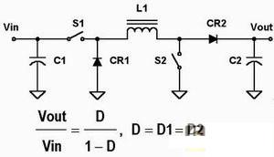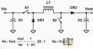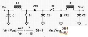 圖1a的電路盡管是四個電路中最復雜的,卻有幾個優(yōu)點。它的輸入和輸出電流被電感平滑處理,減小了輸入和輸出端的紋波電流以及對電容C1和C3的電流應力。但是這一方案也有缺點,電容C2的電流不管是當Vin小于Vout時來自CR1還是當Vin大于Vout來自S2,它都會有中斷,而且它需要兩個電感。