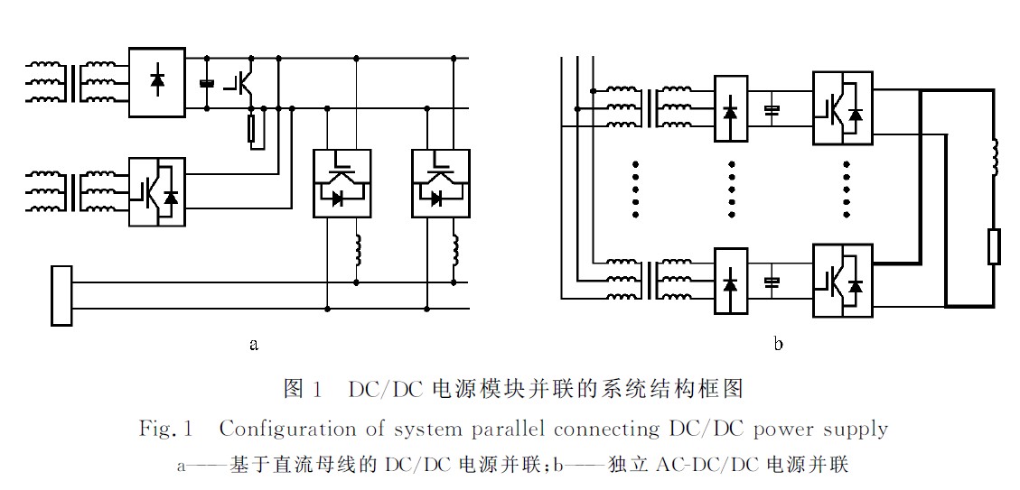 采用圖1a所示的拓撲結構,系統需大容量不可調直流電源,一般可采用整流變壓器降壓,二極管整流并經電容濾波得到。這種結構雖可保證并聯的每條支路有共同的直流電壓輸入,避免并聯支路因直流側輸入電壓不同而帶來的不均衡,但該直流電源的容量大,電流達20KA,直流母線承受的負荷過重,前級AC-DC設備要求較高,不易實現。另外,輸入端共用母線不利于實現完全意義上的獨立電源模塊的并聯。因此,采用如圖1b所示的AC-DC/DC直流電源并聯的拓撲結構。