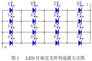 從圖中可以看出當(dāng)其中個(gè)別LED 短路或斷路,也不會(huì)引起整個(gè)燈組熄滅。這種交叉陣列連接方式具有線路簡單,亮度穩(wěn)定,可靠性高,對(duì)驅(qū)動(dòng)要求較低等特點(diǎn)。