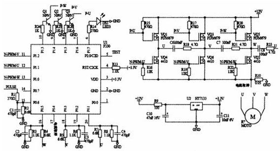 無(wú)位置傳感器控制系統(tǒng)以C8051F330單片機(jī)、逆變橋電路、端電壓檢測(cè)電路、穩(wěn)壓電路等組成。逆變橋電路中上橋臂為P型MOSFET器件FDS6679,下橋臂為N型MOSFET器件M4410B,均為低電壓驅(qū)動(dòng)器件。FDS6679通過(guò)一個(gè)NPN型三極管驅(qū)動(dòng),而M4410B由C8051F330的P1口直接驅(qū)動(dòng)(P1口設(shè)置成推挽輸出)。PWM控制模式定為:PWM僅應(yīng)用于半橋的下端MOSFET,同時(shí)換流的上端(對(duì)角線)MOSFET僅起換相通斷控制。