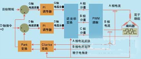 從控制原理上講,磁場(chǎng)定向控制方法的電流環(huán)運(yùn)行是獨(dú)立于電機(jī)旋轉(zhuǎn)的。在FOC方法中存在兩個(gè)實(shí)際的電流環(huán),一個(gè)用于Q軸轉(zhuǎn)矩,另一個(gè)用于D軸轉(zhuǎn)矩。Q軸轉(zhuǎn)矩電流環(huán)施以來(lái)自伺服控制器的用戶目標(biāo)轉(zhuǎn)矩,D軸電流環(huán)則施以零輸進(jìn)指令,以便使不想要的直軸分量降至最低。