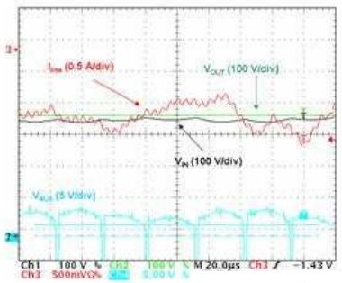 PFC段從輸入線路正弦波電壓源吸收正弦電流,因此,它們為負載提供僅匹配平均需求的方波正弦功率。輸出電容(大電容)“吸收”實際提供的功率與負載消耗的功率之差值。