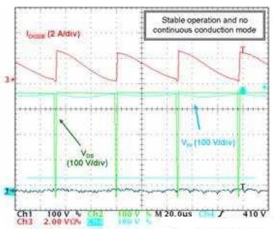 圖4顯示出現不穩定性問題時高輸入線路(正弦波頂端,此處Vin約為380V)下的VAUX電壓。我們可以看到MOSFET關閉時,VAUX電壓輕微躍升至高于ZCD閾值。由于其大紋波的緣故,在退磁相位期間,VAUX電壓首先增加,然后下降。由于在某些開關周期的末段VAUX接近ZCD閾值,這VAUX電壓下降導致零電壓比較器在電感磁芯完全復位前就翻轉(trip)。圖5證實了這一論斷。有時,升壓二極管仍在導電時,PFC段開始新的周期。這個現象主要導致線路電流失真(見紅色跡線)、功率因數退化,并可能有一些頻率處在人耳可聽到的噪聲。