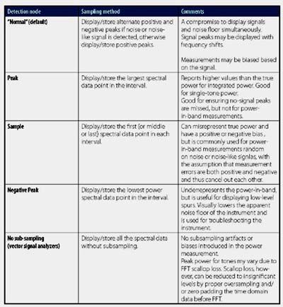 檢測模式是另一種幅度控制方式,可用于傳統(tǒng)的掃描頻譜分析儀,但不能用于基于FFT的分析儀。可分為普通、峰值、采樣或負峰值等模式,具體檢測模式?jīng)Q定了頻譜分析儀如何減少頻譜信息的,或者說如何壓縮頻譜信息。