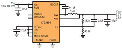 LTC3601 和 LTC3604 是高性能單片同步降壓型穩壓器,分別能提供高達 1.5A 和 2.5A 的電流。這兩款器件在 3.6V 至 15V 的寬輸入電壓范圍內工作,這樣的范圍涵蓋了手持式設備、PC 以及汽車中使用的電池化學組成。它們獨特的恒定頻率 / 受控接通時間架構提供 20ns 的最短接通時間,非常適用于需要高開關頻率和快速瞬態響應,同時能保持高效率的高降壓比應用。