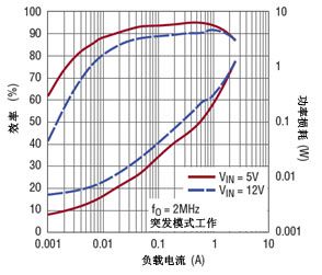 圖 4:突發模式工作在輕負載時產生高效率,而低 RDS(ON) 開關在最大負載時保持高效率
