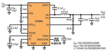 很多微處理器都需要 1.x 的低電壓軌,但是它們也用于需要高開關頻率的應用中,這類應用以高開關頻率保持采用外型很小的無源組件、并使關鍵頻段避開 RF 干擾。問題是,要實現高降壓比和高開關頻率這不可思議的組合可能是難以捉摸的,因為需要這么短的最短接通時間。圖 5 顯示 LTC3604 用在一個 4MHz、12V 至 1.8V 應用中的原理圖。這個應用要求的 38ns 接通時間遠大于 LTC3604 的 20ns 最短接通時間。