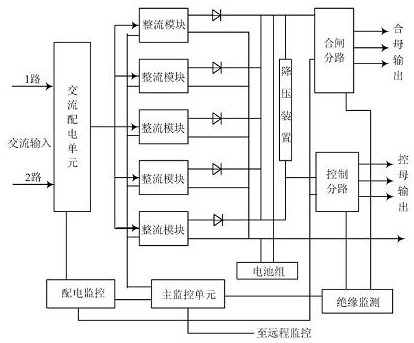 智能高頻開關電源系統的總體結構主要由主監控單元、配電模塊、交流配電單元、整流模塊等組成, 系統總體的結構圖如圖1 所示。系統中的各個監控單元受主監控單元的管理和控制,通過通信線將各個監控單元采集的信息送給主監控統一管理。主監控顯示直流系統各種信息,用戶也可以觸摸顯示屏查詢信息及操作,系統信息還可以接入到遠程監控系統中。系統除了交流監控、直流監控、開關量監控等基礎單位外,還配置了絕緣監測、降壓裝置、電池巡檢等功能單元,以達到對直流系統進行全面監控的目的。