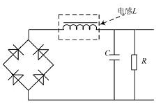 即功率因數校正( Pow er Factor Correct ion, PFC)是指有效功率與總耗電量( 視在功率) 之間的關系,也就是有效功率除以總耗電量( 視在功率) 的比值。無源PFC 是指不使用晶體管等一些有源器件組成的校正電路,一般情況下由二極管、電阻、電容和電感等無源器材組成。本文的PFC 主要是在整流橋堆和濾波電容之間加1 個電感, 具體原理如圖3 所示,利用電感上的電流不能突變的特性來平滑電容充電強脈沖的波動,改善電路中電流的畸變,并且利用電感上的電壓超前于電流這一特性來補償濾波電容電流超前電壓的特性, 使功率因數和電磁干擾都得以改善。