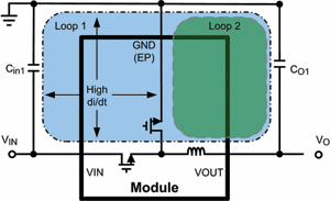 環(huán)路2是在內(nèi)部高端MOSFET的關(guān)斷時間以及低端MOSFET的導(dǎo)通時間內(nèi)形成的。內(nèi)部電感器中存儲的能量流經(jīng)輸出旁路電容器和低端MOSFET,最后返回GND(如圖1所示)。兩個環(huán)路互不重疊的區(qū)域(包括環(huán)路間的邊界),即為高di/dt電流區(qū)域。在向轉(zhuǎn)換器提供高頻電流以及使高頻電流返回其源路徑的過程中,輸入旁路電容器(Cin1)起著關(guān)鍵作用。