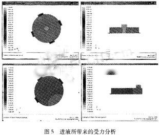檢測過程中應考慮液體輸入微反應室時對工作電極表面敏感膜及室壁產生的力的作用,因為力的作用不當會產生敏感膜脫落的現象。實驗過程中通過合理地設計選擇進液口位置來優化力的分布,減少對敏感膜表面產生的沖擊。在設計的4種結構中,對進液口位置的選擇分成中心處和邊緣處兩種,兩種結構的壓力分布圖對比如圖5所示。在進液管道附近,液體產生較大的力的作用,而將進液口從反應區域正上方移至邊緣處,其產生的力會在中心敏感區域外圍被電極周邊區域和富有彈性的PDMS室壁緩沖而減弱,不會影響到敏感膜生成區域,較好地解決了進出液對敏感膜可能造成的損害問題;而在中心開口的兩種結構位于敏感反應區上方,如圖可見試劑輸人時會有力作用于中心處,特別是當液體輸入速度較高時,會對敏感膜造成損傷。
