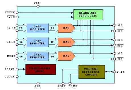 因此,假如有一個1024×1024@60Hz的圖像系統,回掃因子為0.8。那么:時鐘頻率=點速率=1024×1024×60/0.8=76.8Hz。所要求DAC的時鐘頻率是78.6MHz。CS7123的最大時鐘頻率為240MHz,因此可以支持最高達到1600×1200@100Hz的分辨率。