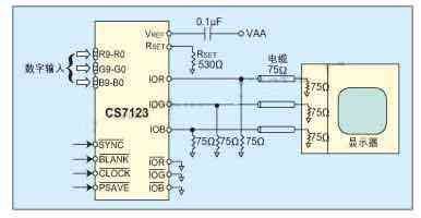 CS7123還有SYNC同步信號和BLANK黑電平控制信號這兩個附加的視頻控制信號,CS7123也具有一個待電模式。CS7123采用5V CMOS工藝制造,單片CMOS結構確保了低功耗性能。CS7123的主要功能是將三路RGB信號轉換為模擬RGB信號后輸出到顯示屏顯示。另外,它也可以當作三路單獨的DAC使用。