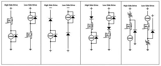 對于將大功率MOSFET用于各種負載的固態開關動作的電子模塊,其他極性接反的情況主要集中在驅動配置的高壓側或低壓側(見圖3a)。在極性接反的狀態下,大功率MOSFET的內在二極管變為正向偏置,并允許電流能夠流至與其連接的電機、燈或電磁閥負載(見圖3b)。