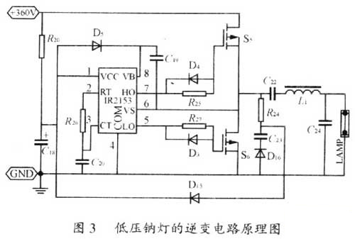 低壓鈉燈啟動電路采用了LC串聯諧振變換器,它是一種普遍應用于電子鎮流器的電路拓撲,特別適合在熒光燈、低壓鈉燈等電子鎮流器中使用。它結構簡單,便于設計,可靠性高,可以滿足燈啟動和穩態工作的要求。LC諧振變換器由諧振電感L1、串聯諧振電容C22和并聯諧振電容C24組成,在低壓鈉燈啟動前,由于低壓鈉燈無燈絲,并且電弧管中填充的隋性氣體未氣化,所以燈處于相當高的阻抗狀態,可以認為燈處于開路狀態。在半橋LC諧振變換器中,串聯諧振電容C22,和并聯諧振電容C24共同串聯在一起和諧振電感L1在交流電源驅動下諧振,從而在C24兩端產生高電壓;在穩態工作的半橋LC諧振變換器中,串聯諧振電容C22和諧振電感L1在交流電源驅動下為燈負載供電,提供穩態工作所需的燈端電樂和燈電流,在并聯諧振電容C24中通過很小的旁路電流。